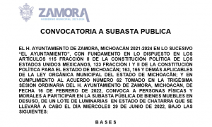 CONVOCATORIA A SUBASTA PUBLICA EL H. AYUNTAMIENTO DE ZAMORA, MICHOACÁN 2021-2024 EN LO SUCESIVO “EL AYUNTAMIENTO”, CON FUNDAMENTO EN LO DISPUESTO EN LOS ARTÍCULOS 115